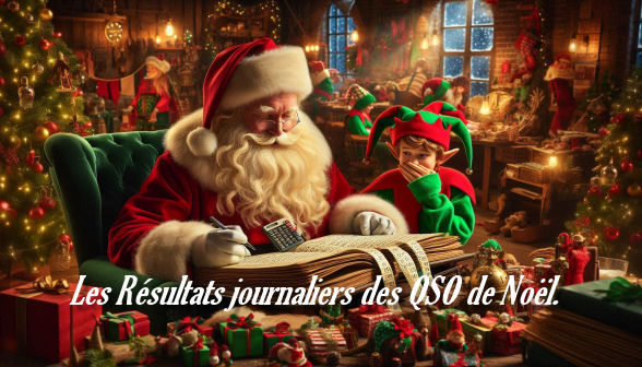 Voici les résultats journaliers des QSO de Noël. Il reste une seule journée pour marquer des points. Aujourd’hui nous avons encore un bouleversement dans l’ordre des 3 premiers concurrents. Demain vous pourrez encore prendre 4 points avant la ligne d’arrivée. C’est l’occasion de de se placer sur la plus haute marche du podium pour le trio de tête, ou de se placer devant le podium pour les retardataires. L’arrivée risque d’être chaude et faire fondre la neige chez le Père Noël.