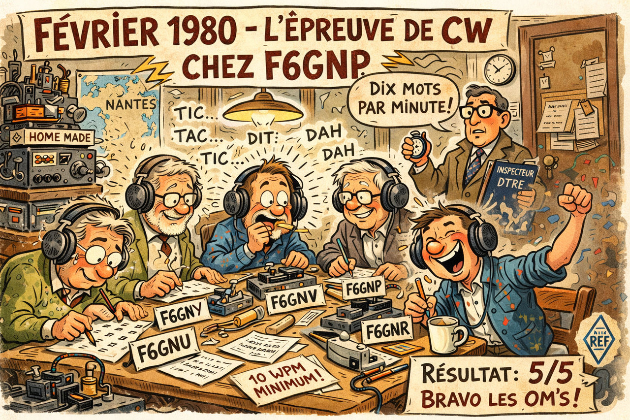 C'était en février 1980 et, à cette époque, les examens de passage (F1, F6) avaient lieu au domicile du demandeur avec la visite de l'inspecteur-examinateur de la DTRE (Direction des Télécommunications et des Réseaux Extérieurs), qui vérifiait à la fois l'équipement de la station — de préférence home-made — et les connaissances du candidat (technique, réglementation, aptitude au trafic).