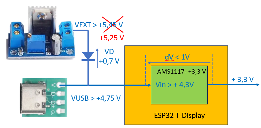 Lorsque VEXT alimente seule l’ESP32, la tension est de +4,55 V ce qui est bien supérieure aux +4,3 V imposés par le régulateur +3,3 V.