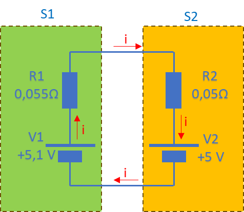 Dans l’exemple ci-dessous, la source S1 possède un générateur de tension de +5,1 V et une résistance interne de 0.055 Ω. S2 est équivalent à un générateur de +5 V avec une résistance de 0.050 Ω